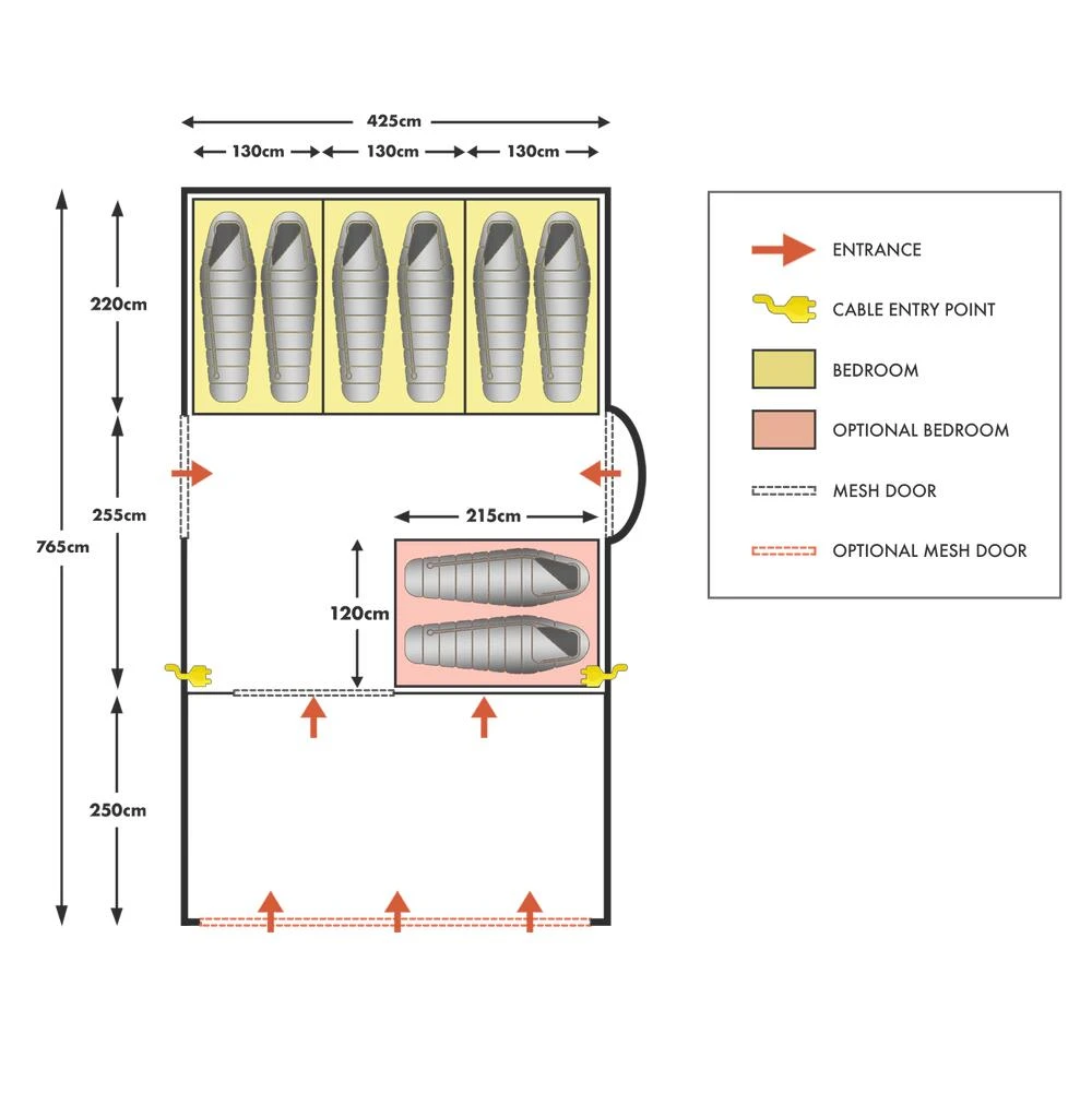 - Spacious and Comfortable: Accommodating up to 8 people (6 people as standard), the AirTek 6 offers a palatial camping experience. The large generous bedroom at the rear of the tent is designed in a 2+2+2 configuration, with zipped dividers for added privacy. You can customize the layout to your liking and even combine all rooms into one, creating a versatile and comfortable living space.