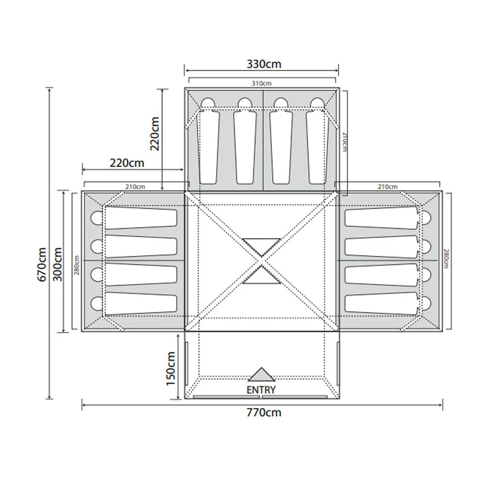 A vast yet lightweight and compact hybrid group and family air tent which represents incredible value for money. The frame of this twelve berth podded style tent is made up of both a welded central inflatable tube and 4 fibreglass poles, a hybrid which ensures both high performance and superb stability at a fantastic price point. We have afforded an ideal allocation of usable space for families and groups in this design, split between a generous commune area, and three darkened ‘Twilight’ 4-person bedrooms that can be split down to a 2/2 configured using the toggle in divider. Our bedroom ventilation system, a front mesh ventilation fly screen panel and crystal-clear window panels maintain an airy internal space and maximise airflow in warmer temperatures. There is an option to add a further Sun Canopy to the front of this tent to offer an ideal shaded area for relaxation, cooking, or dining. Outdoor Revolution understand that comfort has become a prerequisite for the modernized camper, which this tent comes complete with a Dura-tread Carpet and a Footprint Groundsheet, adding to the already outstanding value of this family tent. • 120HDE high density all weather lightweight fabric