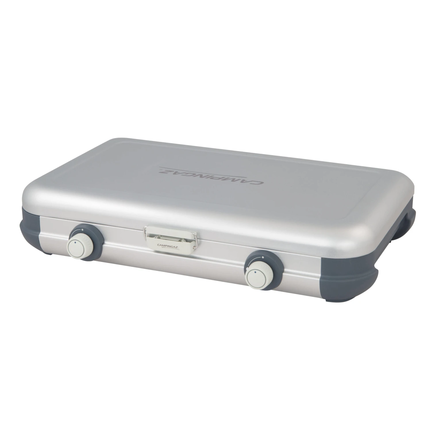 Designed for campers looking for a 2-hob stove that’s powerful, protective and compact.This stove works with a CV 470 cartridge. It has a protective lid and 2 enamel saucepan stands with built-in windshields on the burners.