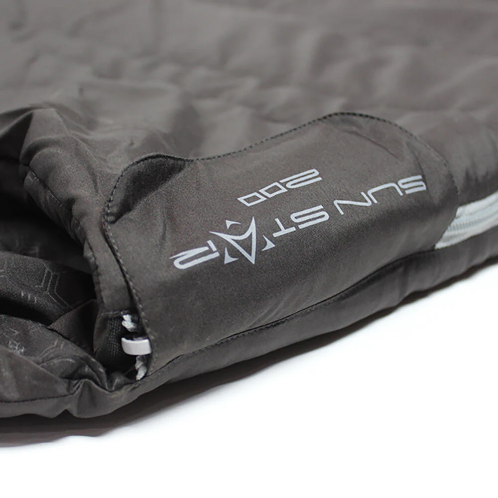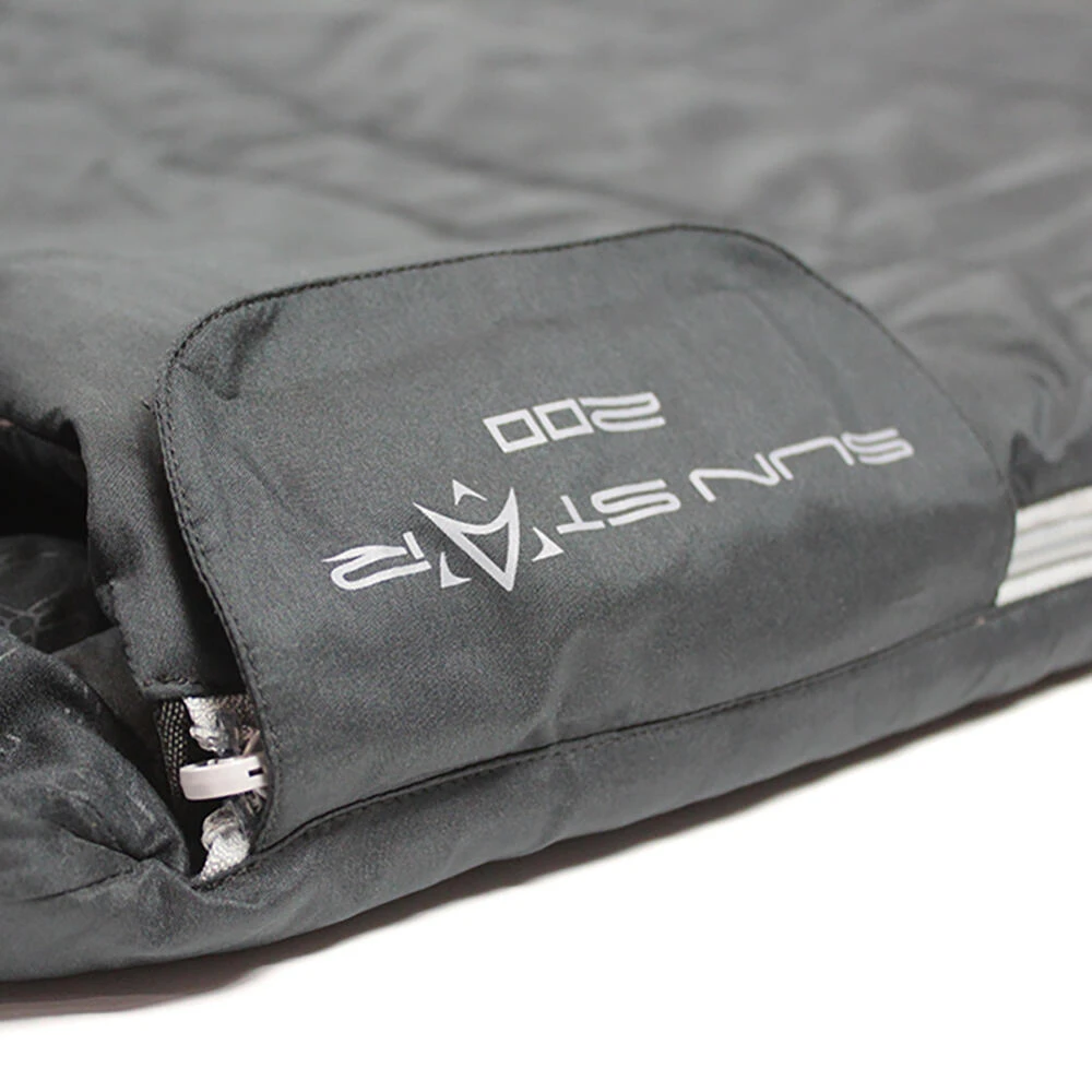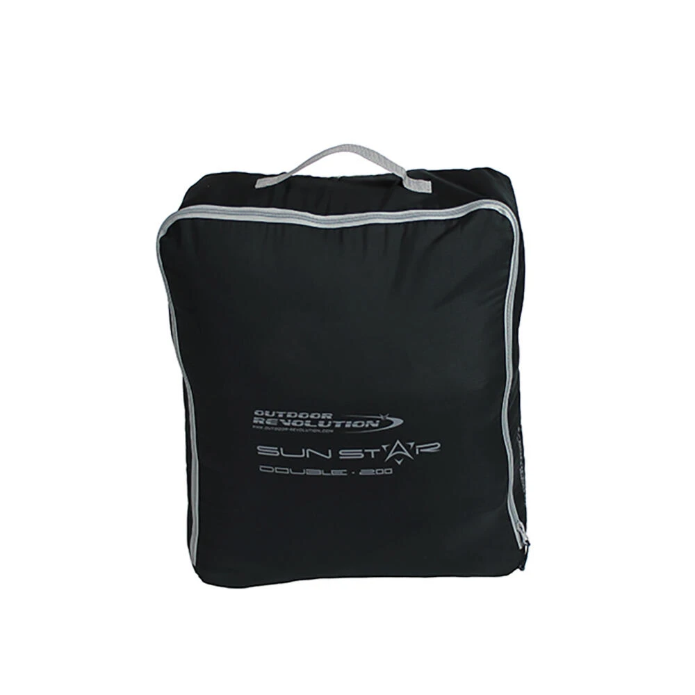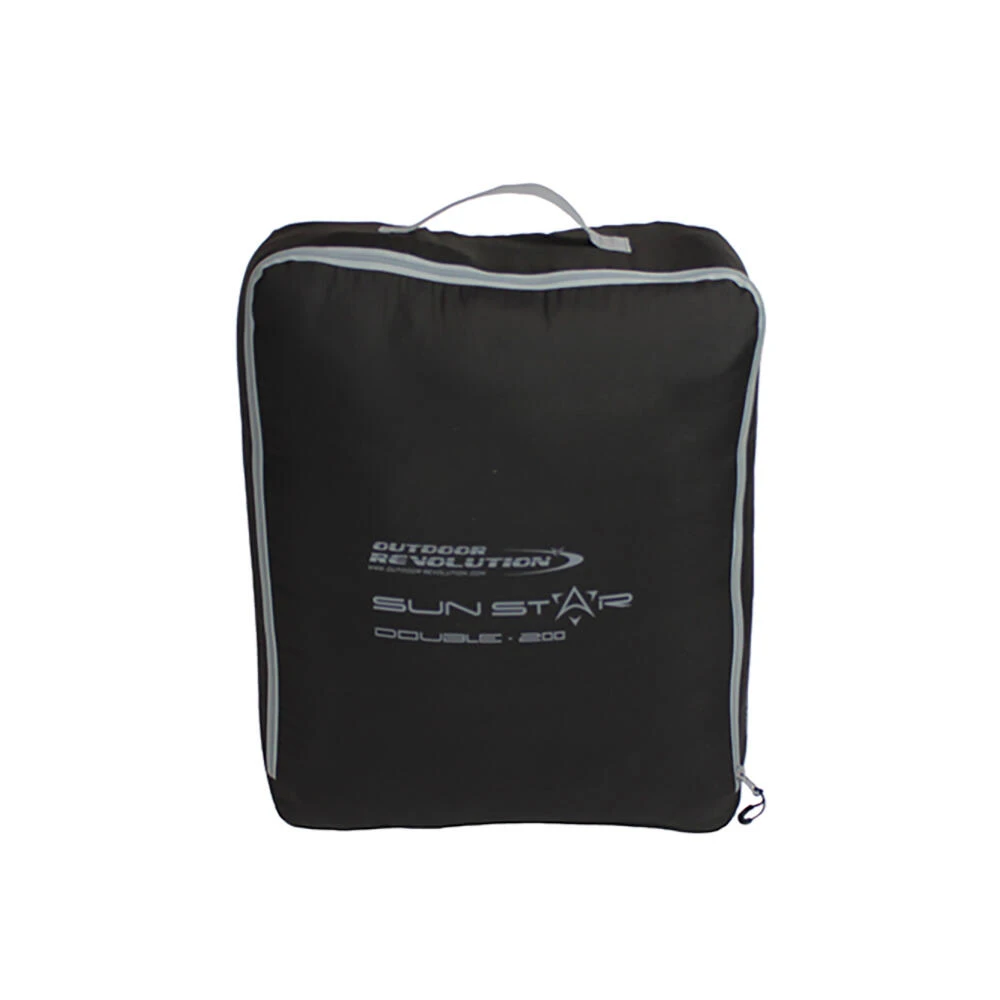 A Summer weight, double square sleeping bag with a cowl hood, and is perfectly suited to comfortable family camping in the UK and Europe from late Spring through to late Summer. This bag comes in both left and right-hand side zips which allow each user to exit the bag without disturbing the other. There is also a third zip at the base which allows extra ventilation around the foot area on those hot nights under canvas. The outer shell fabric feels soft and warm thanks to the micro polyester and the lining is also warm to touch thanks to the brushed embossed 190T polyester. All round the Sun Star Double 200 is an excellent lighter weight mid-level sleeping bag that has not compromised on quality or features and will give the users many years of comfort and pleasure. Pack Size 48 x 40 x 15cm • Filling: 1x200g/m2 single layer 30% single hole hollow fibre / 70% polyester fill